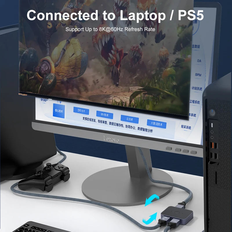 Le Mathiateur HDMI 1080 8K 60Hz 4K 120Hz 2 en 1 sortie pour TV Xiaomi Xbox SeriesX PS5 est un câble HDMI moniteur 2.1 P avec 1 entrée et 2 sorties.