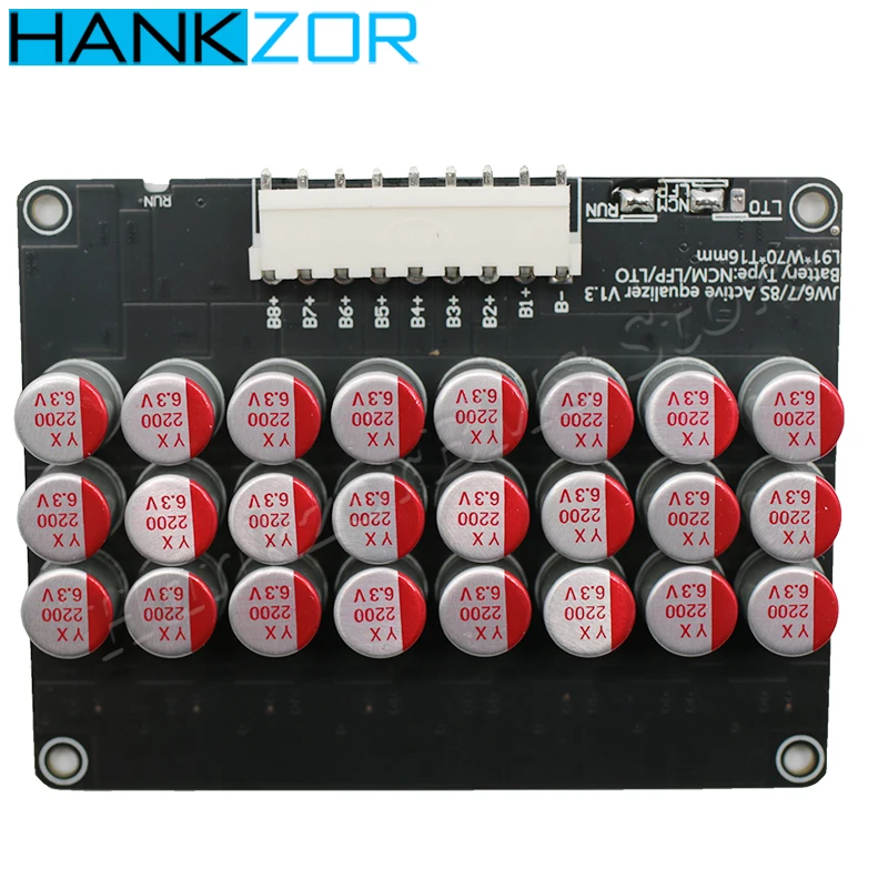 The capacitor fit transfers the charge mover, the equalization board is connected to the battery, and the equalization is started. The original new ultra-low internal resistance MOS, 2OZ copper thickness PCB. The more balanced the battery, the smaller the current. With manual sleep switch, sleep current mode is less than 0.1mA. The balance voltage accuracy is within 5mv. The quiescent current is about 12 mA. It is recommended that the battery capacity is 60-300AH. With under-voltage sleep protection, the voltage will stop automatically when the voltage is lower than 3.0V, and the standby power consumption is less than 0.1mA. Suitable for ternary lithium, lithium iron phosphate, lithium titanate.