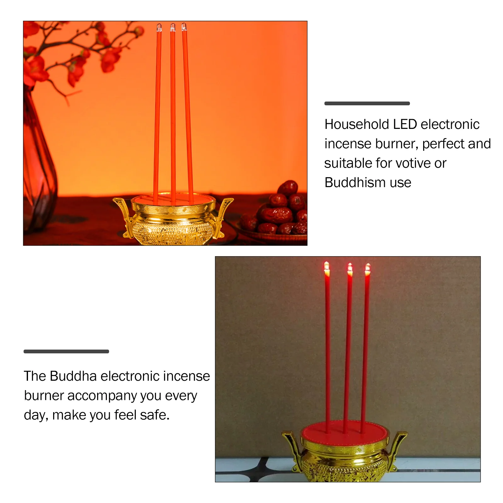 Elle est sans flamme, sûre et sécurisée, ce qui en fait une parure décorative parfaite pour votre table ou bureau. Le brûleur d’encens LED apporte une touche de sérénité et de calme à votre maison, jardin et salon.