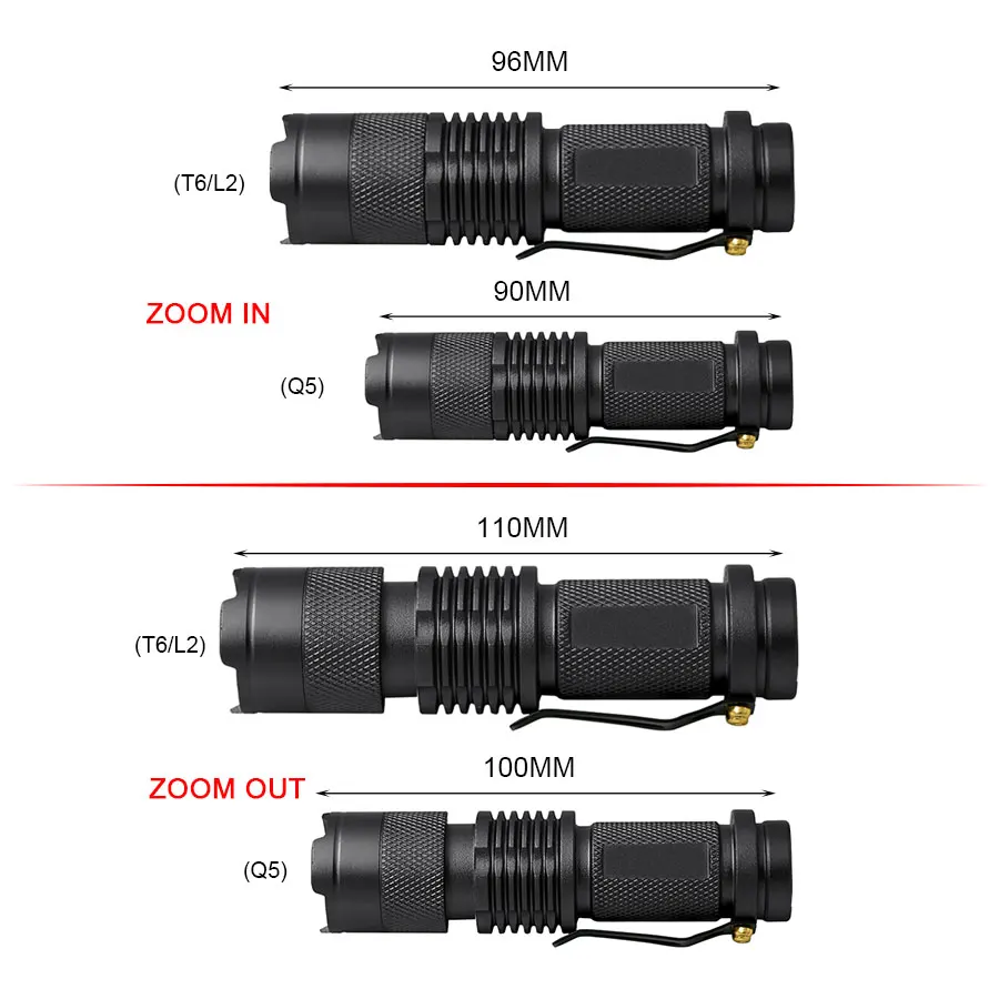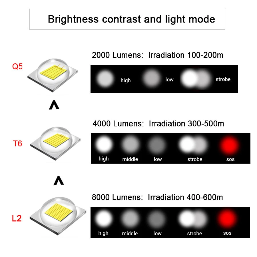 Le mode Q5 propose 3 modes (stroboscope haut-bas) tandis que le mode T6/L2 offre 5 modes (haut-moyen-bas-SOS-stroboscope).