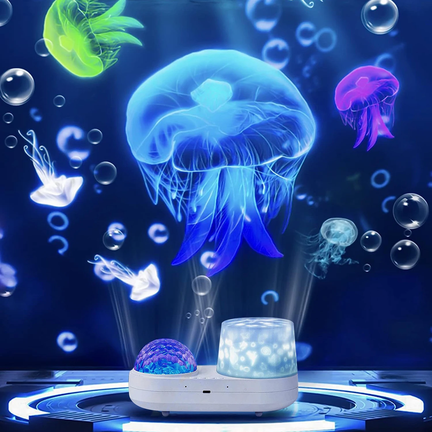 - Projection de vagues océaniques et de motifs d’animaux marins pour un effet stéréo de l’océan 3D