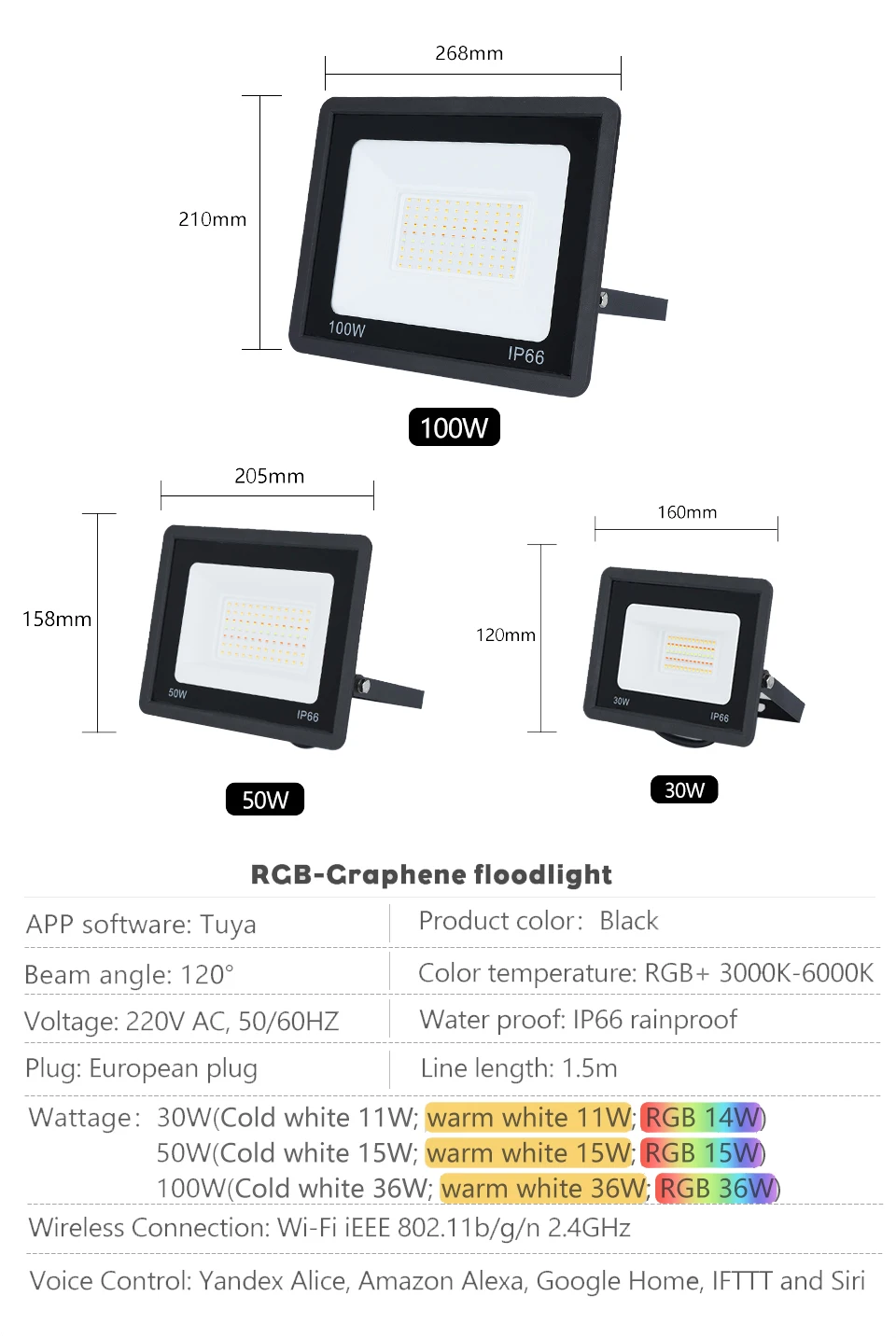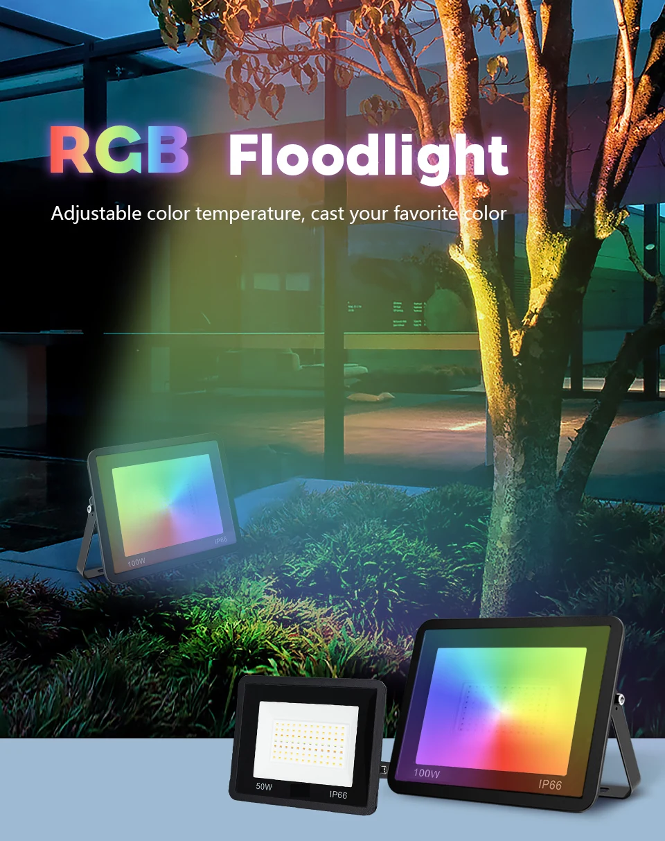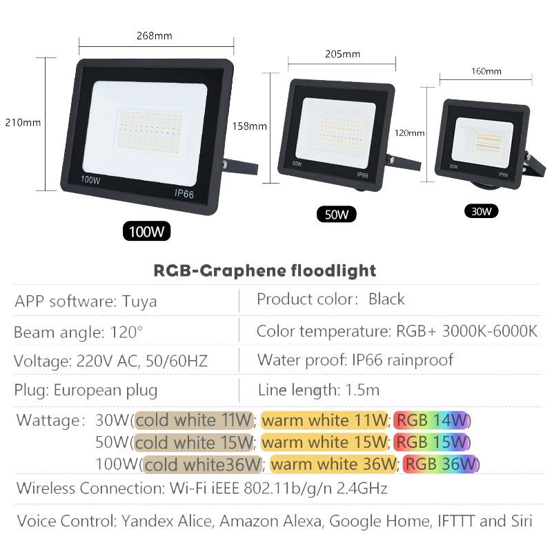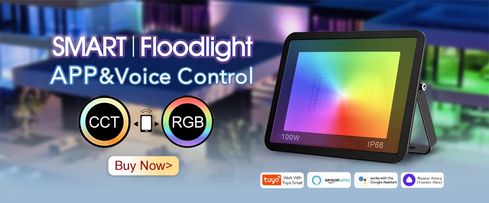 Le projecteur intelligent LED 220V est un éclairage d’extérieur réglable avec une commande vocale. Il est disponible en trois puissances différentes: 30W, 50W et 100W. Ce projecteur est compatible avec l’application Tuya, ce qui vous permet de le contrôler à distance via Wifi ou Bluetooth.