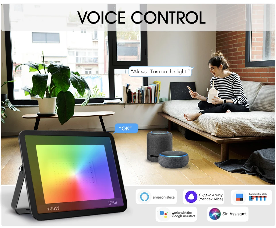 Grâce à la compatibilité avec Yandex Alice, Amazon Alexa, Google Home, IFTTT et Siri, vous pouvez contrôler ce projecteur intelligent LED à l’aide de votre voix. Il vous suffit de donner des instructions à votre assistant vocal pour ajuster les couleurs, la luminosité et bien plus encore.