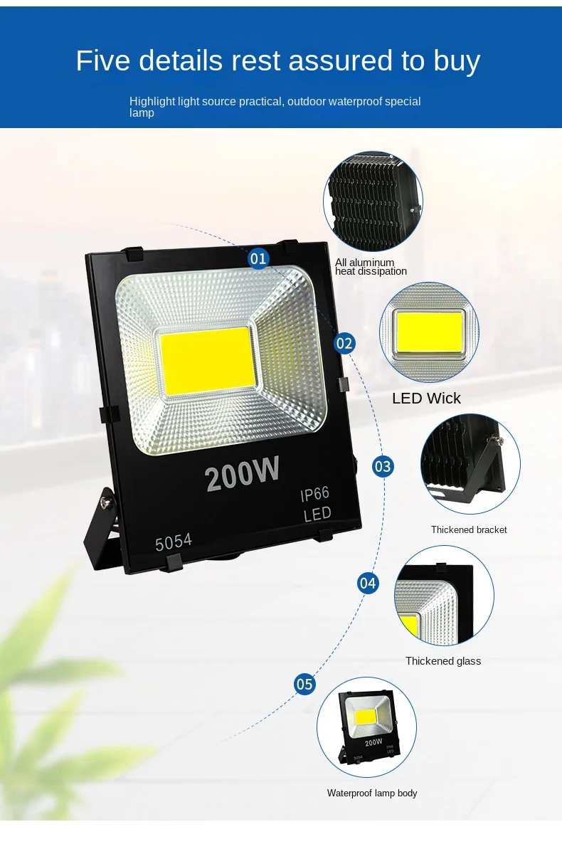 Le projecteur dispose d’un angle de faisceau de 120°, offrant un éclairage efficace pour les grandes surfaces. Sa conception étanche IP66 lui permet de fonctionner normalement même sous la pluie, le grésil et la neige, ce qui le rend adapté à une utilisation en intérieur et en extérieur.