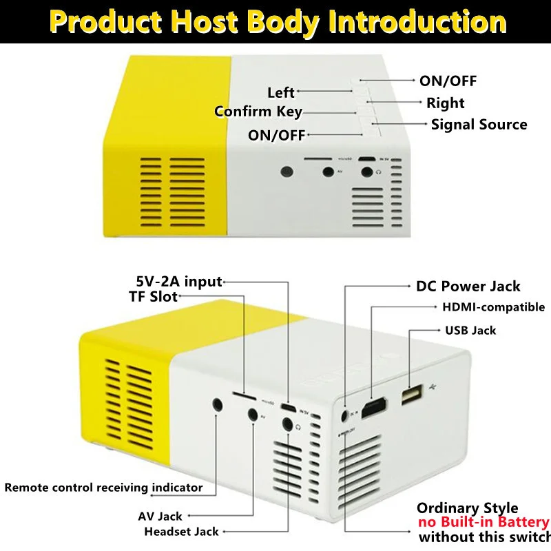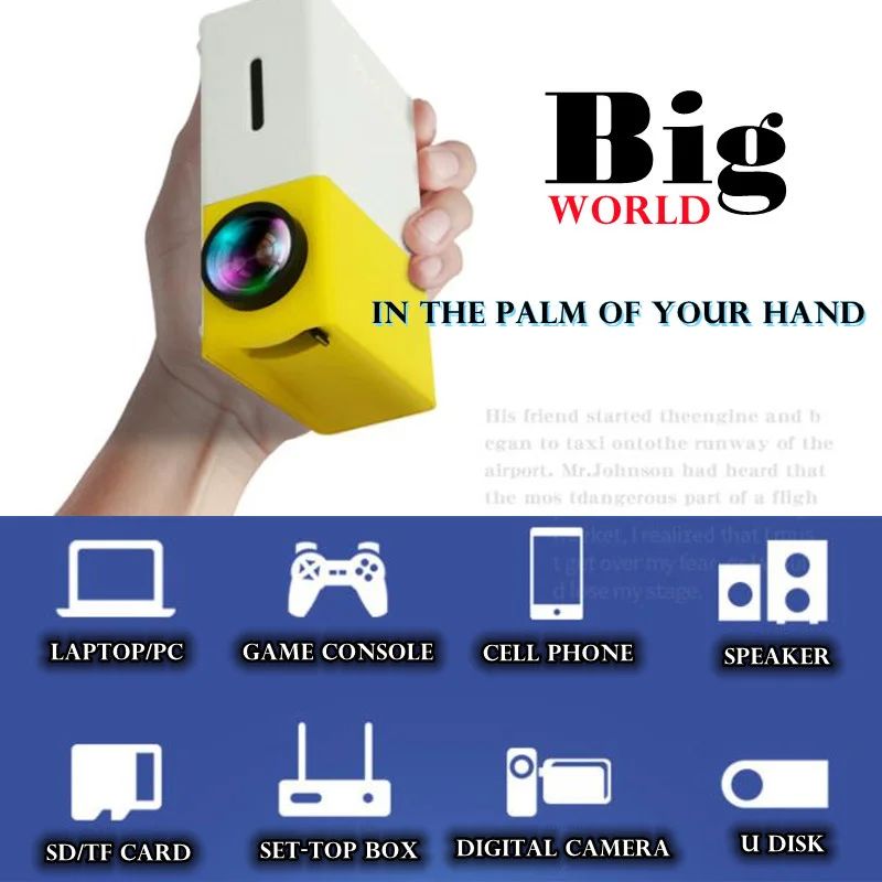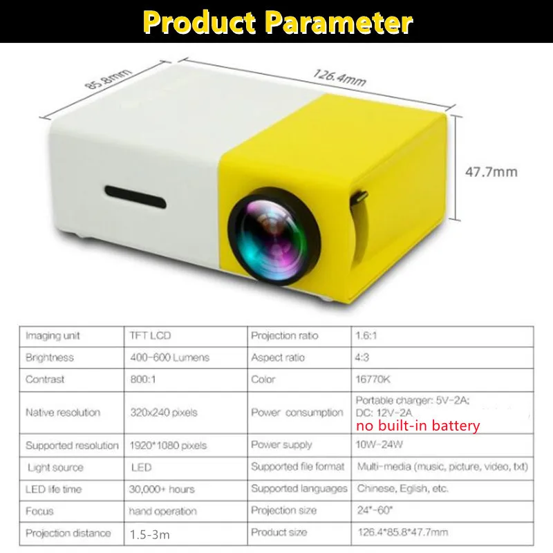 Le YG300 Pro-Mini Projecteur LED est un projecteur compact et portable qui prend en charge une résolution HD 1080p. Il dispose d’une technologie d’affichage LCD et offre une luminosité de 400-600 Lumens. Avec son rapport de contraste de 800:1, il offre des images claires et nettes. Le projecteur a une distance de projection de 1.5-3 m et peut afficher des images de taille 20-60 pouces. Il est compatible avec les interfaces HDMI, USB et audio 3.5mm, ainsi qu’avec les cartes TF. Il est certifié CE, ROHS et FCC.