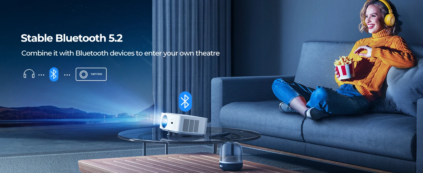 Ce projecteur 4K adopte la technologie WiFi-6 qui offre une connexion sans fil ultra-rapide aux appareils iOS, Android et tablettes. Vous pouvez profiter d’une expérience de jeu en ligne fluide et d’un streaming vidéo plus rapide. De plus, la puce Bluetooth 5.2 permet une connexion sans fil aux écouteurs, haut-parleurs ou AirPods Bluetooth, pour une expérience audio immersive et des effets surround cinématographiques.