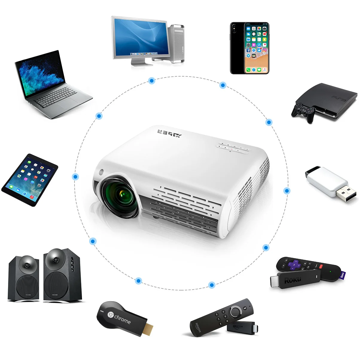 Ce vidéoprojecteur offre une taille de projection allant de 45″ à 300″, en fonction de la distance (1.5 – 5.5 mètres). Il est équipé de ports HDMI, USB, VGA et AV, ce qui permet une compatibilité étendue avec de nombreux appareils tels que les TV box, Amazon Stick TV, PC, ordinateurs portables, tablettes, Xbox, lecteurs DVD, iPad, iPhone et smartphones Android.